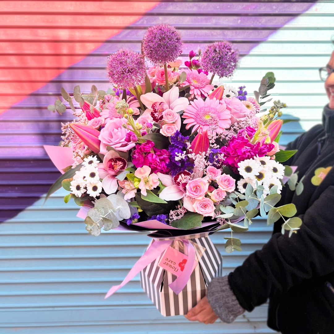 Blooms fit for a queen! This showstopping bouquet of luxurious purples and pinks is a surefire way to make your mother’s day!