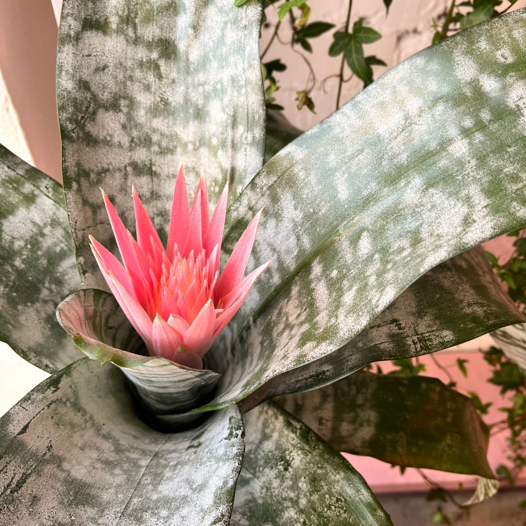 The Aechmea Fasciata (or Urn Plant) is a flowering plant in the bromeliad family. They grow best with partial sunlight and moist but well drained soil. To keep your urn plant happy, allow the soil to dry out between watering, and keep the central cup-shaped opening formed by the plant’s leaves at least half full of water at all times.
