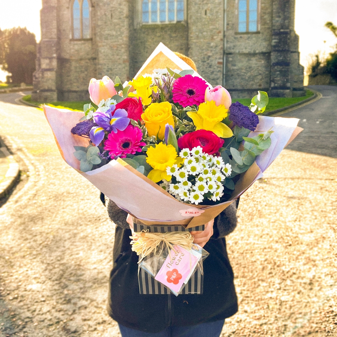 Spring has sprung! A bright and cheery handtied selection of spring blooms in yellows, purples and cerise pink.